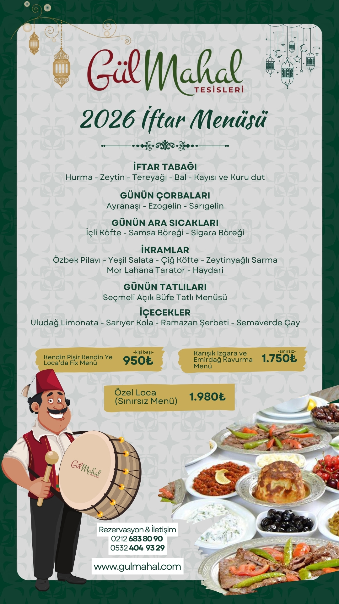 Anadolu Mutfağının en lezzetli ana yemekleri, geleneksel tatlı çeşitleri, Osmanlı şerbetleri, semaver çayından oluşan zengin iftar menüsüyle Gülmahal Sosyal Tesisleri, ramazan boyunca sizi bekliyor.